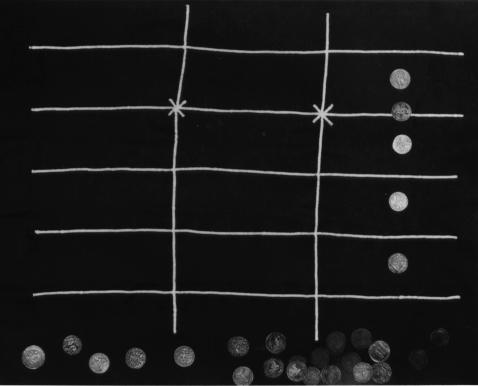 Actually we already have the answer, but after simplification the result is shown much clearer: Remove 5 counters from the bottom line and put instead a counter in the V-space between the I-line and the X-line. This one together with the counter already being in the V-space are replaced by one counter on the X-line. Now we have five counters on the X-line which we replace by one in the L-space. (If you cannot see through anymore there is only one solution: Draw a few lines on a piece of paper and do the addition yourself with a few dimes or something like it.) Finally we replace the two L-counters by one on the C-line and we see the number CCCI or 301. (figure c)